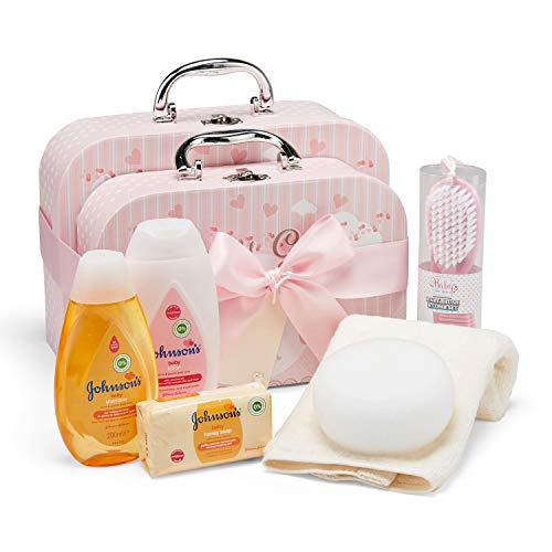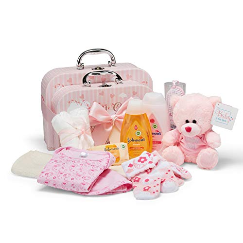 An impressive selection of baby gifts arranged in 2 beautiful keepsake boxes tied together with a pink satin ribbon. A combination of baby clothes, teddy bear and bath time essentials create the ultimate baby gift set that is sure to stand out from the crowd