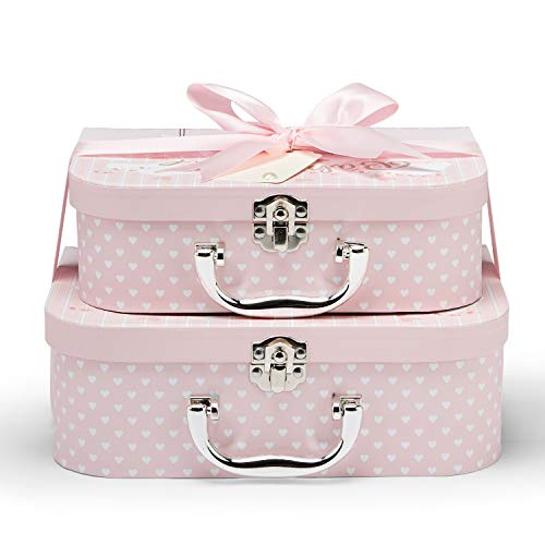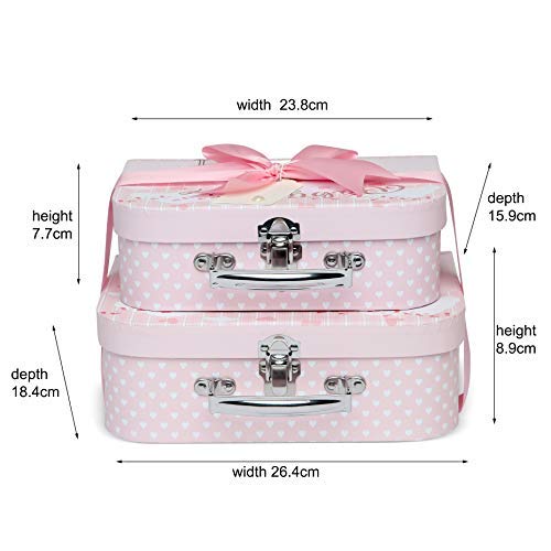 2 x Keepsake Boxes – Pink themed design with Baby Girl on the top opening lid. The boxes are styled as cases with a steel clasp fastener and ornate silver handle. Manufactured from 1200gsm board to provide a sturdy quality box that will endure. CASE SIZES: 25.4cm x 17.6cm x 8.4cm AND 22.8cm x 15cm x 7.2cm