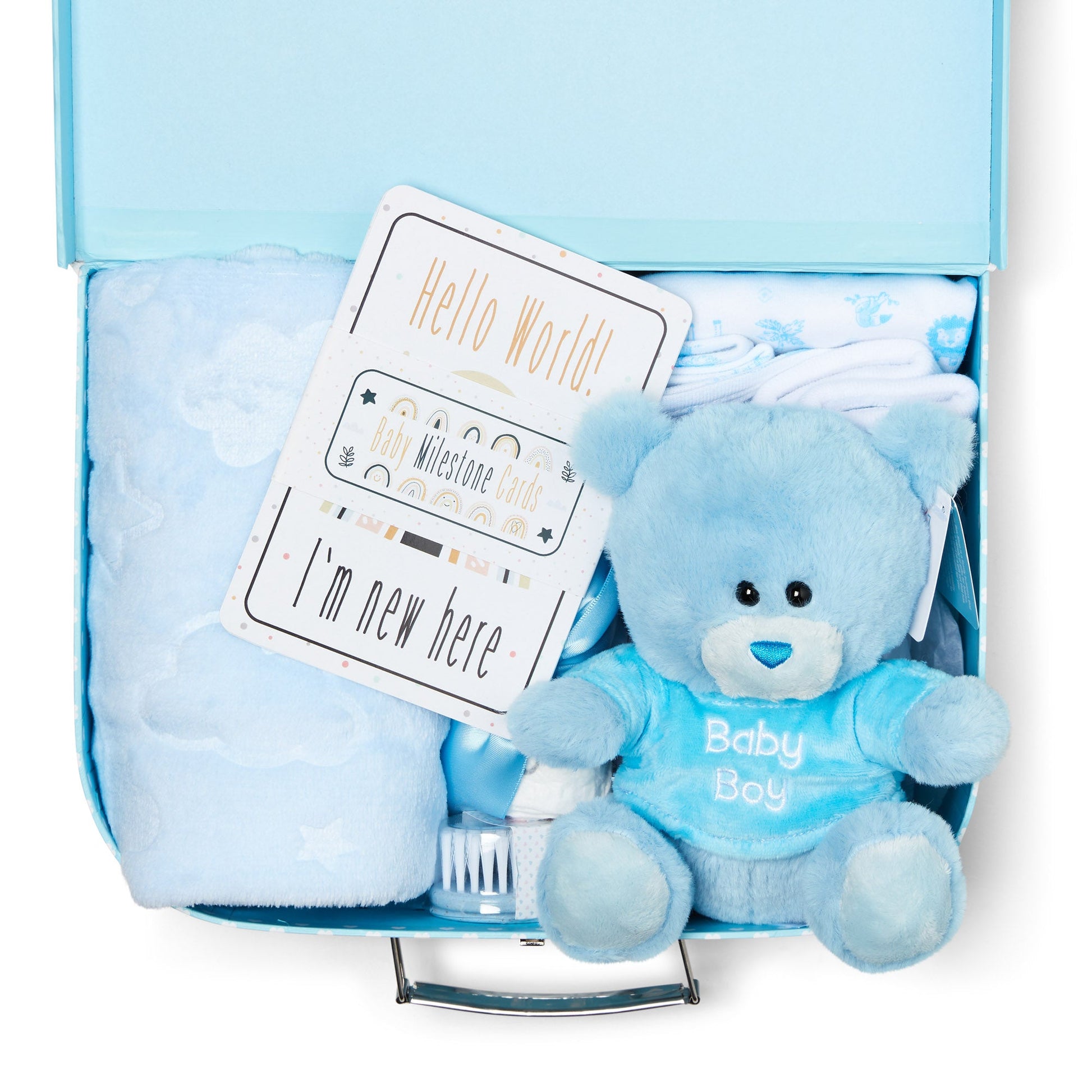 - Perfect Baby Boy Gifts: This hamper contains a cute teddy bear, a bodysuit, a pair of socks, and a velcro bib - the best baby boy gifts newborn parents could ask for encased in a cute sky blue baby hamper. Size dimensions: L: 29.2 x W: 21.6 x H: 10.1