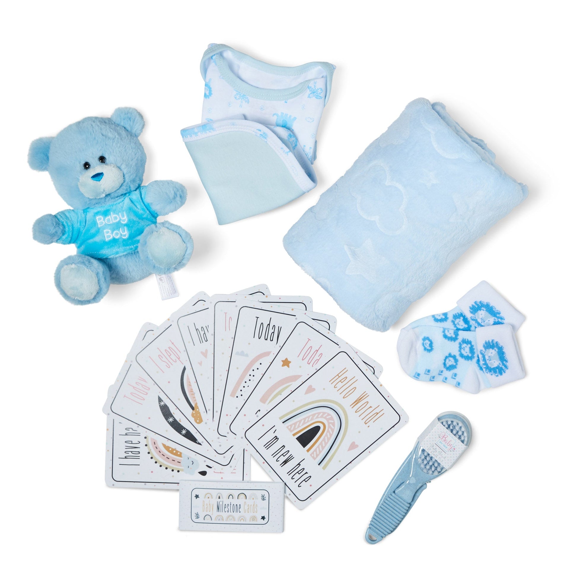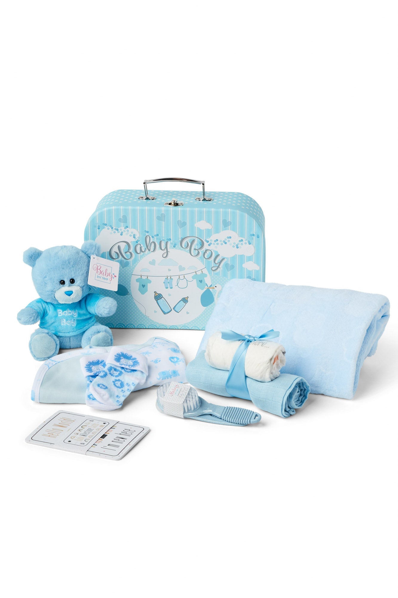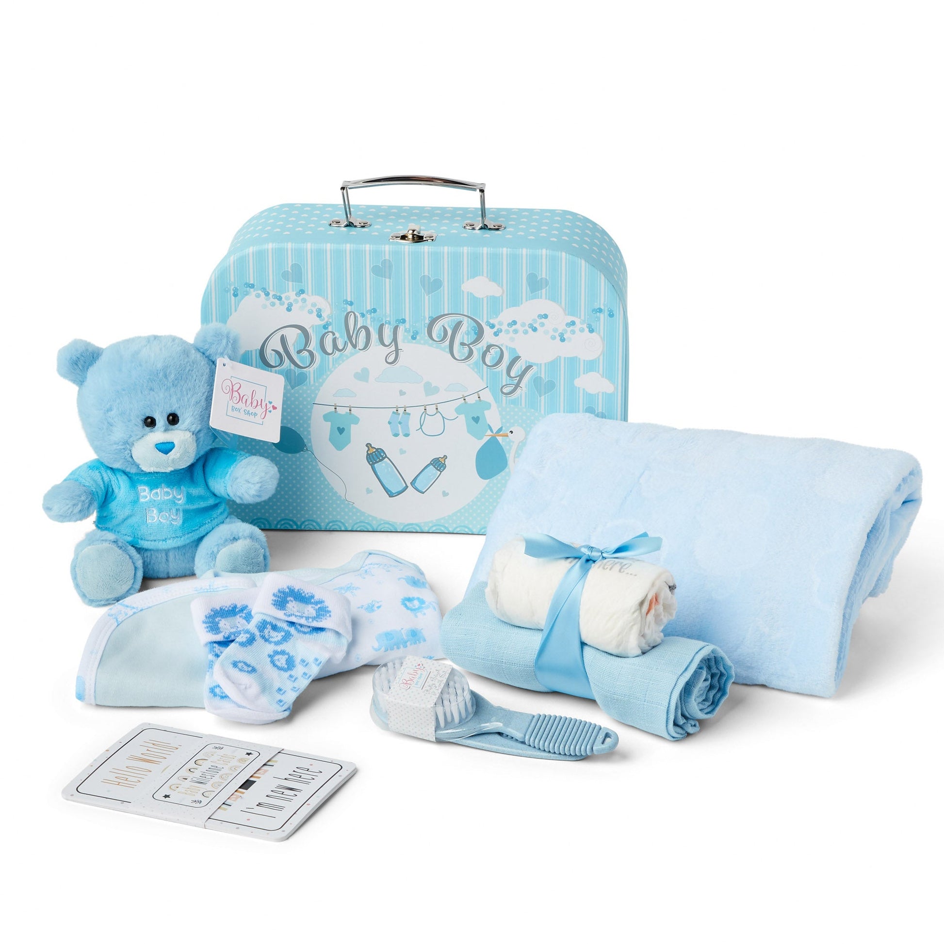 Step into the world of Baby Box Shop where you will discover essential newborn baby items carefully curated to make the early days of your little one smoother. This delightful Baby Box is packed with baby newborn essentials, from a cuddly Teddy Bear to a soft Fleece Wrap, all meticulously designed for your baby's comfort. The box case doubles as a baby bath box to organize all your baby bath accessories. Speaking of baths, our baby bath set includes a soft baby Bath Cloth and a gentle baby Bath Brush ideal for your newborn's delicate skin. Our set also includes a comfortable Bodysuit, a pair of Cosy Socks, a Velcro Bib and a Muslin Cloth to keep your baby warm and clean. Also included are baby bath essentials like 2 x Nappies for those unexpected moments and a Baby Bath Hair Brush newborn for your little one's delicate scalp. But that's not all; we've included 8 Double-Sided Baby Milestone Cards, perfect for capturing those precious moments. These make for unique baby shower gifts, baby boy gifts newborn and baby boy gifts newborn. The box also serves as a unique baby shower gift, a perfect choice for baby shower gifts boy or baby shower gifts boy. Whether you're looking for new baby boy gifts, personalised baby boy gifts, baby boy gifts keepsake or baby shower gifts unisex, Baby Box Shop has you covered. Each item in the box is selected keeping in mind the newborn essentials boy and boy would need. From baby bath towels newborn to newborn essentials boy, we've got it all. Baby Box Shop's unique baby boy gifts and baby boy gifts newborn hamper are designed to be cherished for a lifetime. Our baby bath towel set and baby bath kit make bath time a breeze. Our newborn essentials set and baby boy items newborn essentials are all you need to welcome your new bundle of joy. Join the Baby Box Shop family and give your baby the care they deserve.