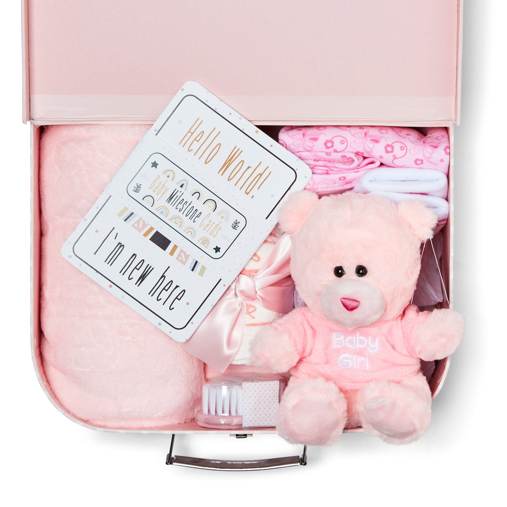 - Perfect Baby Girl Gifts: This hamper contains a cute teddy bear, a bodysuit, a pair of socks, and a velcro bib - the best baby girl gifts newborn parents could ask for encased in a cute rose pink baby hamper. Size dimensions: L: 29.2 x W: 21.6 x H: 10.1
