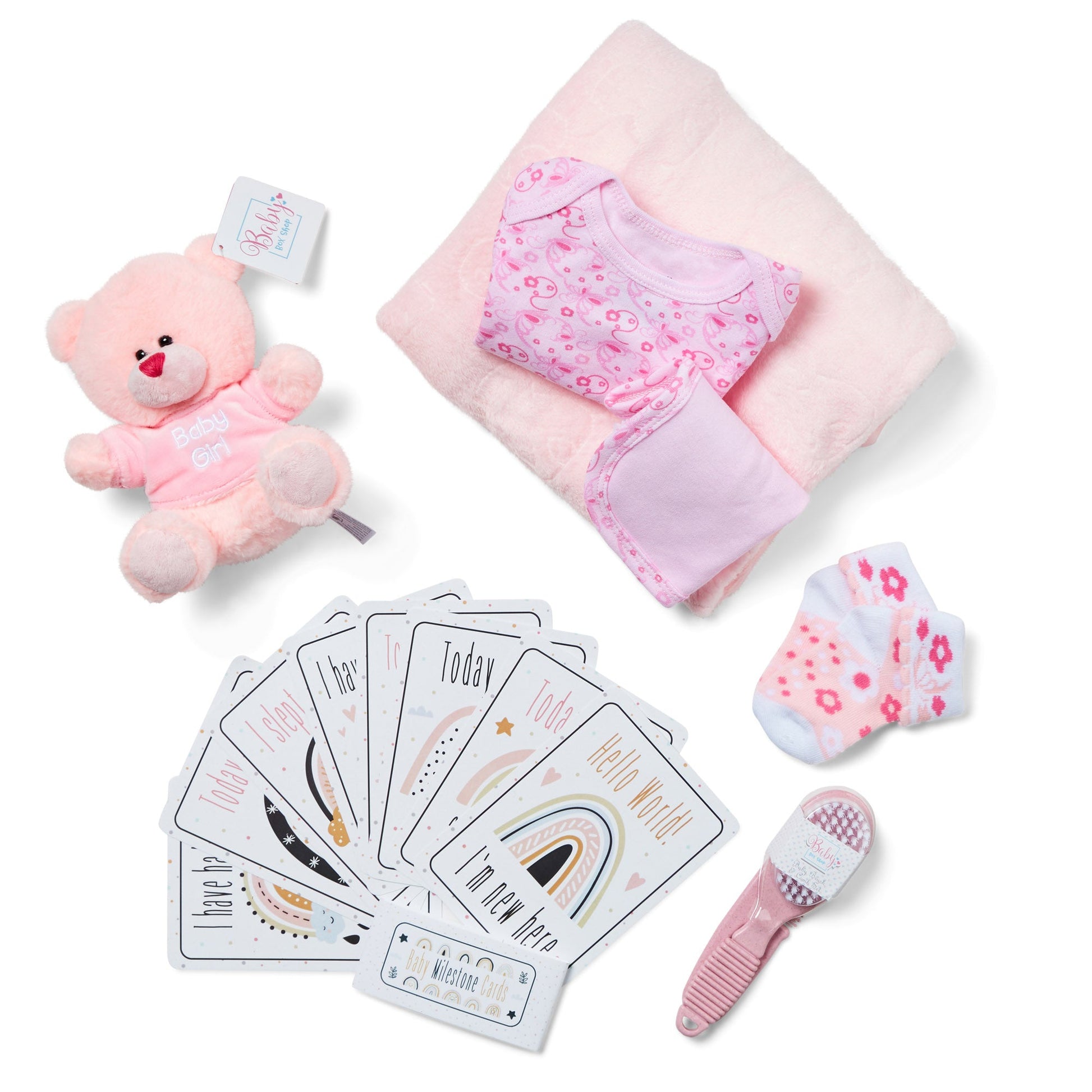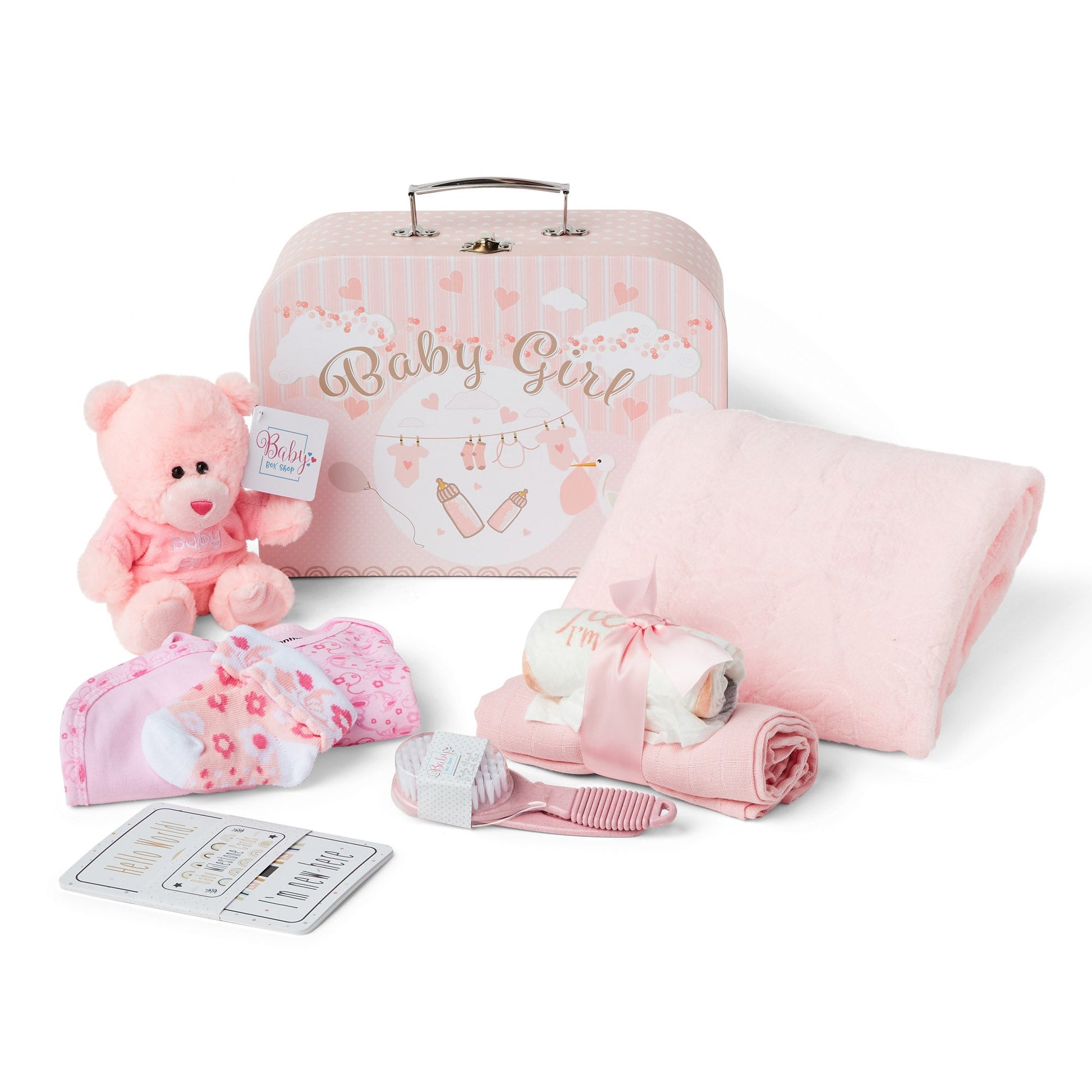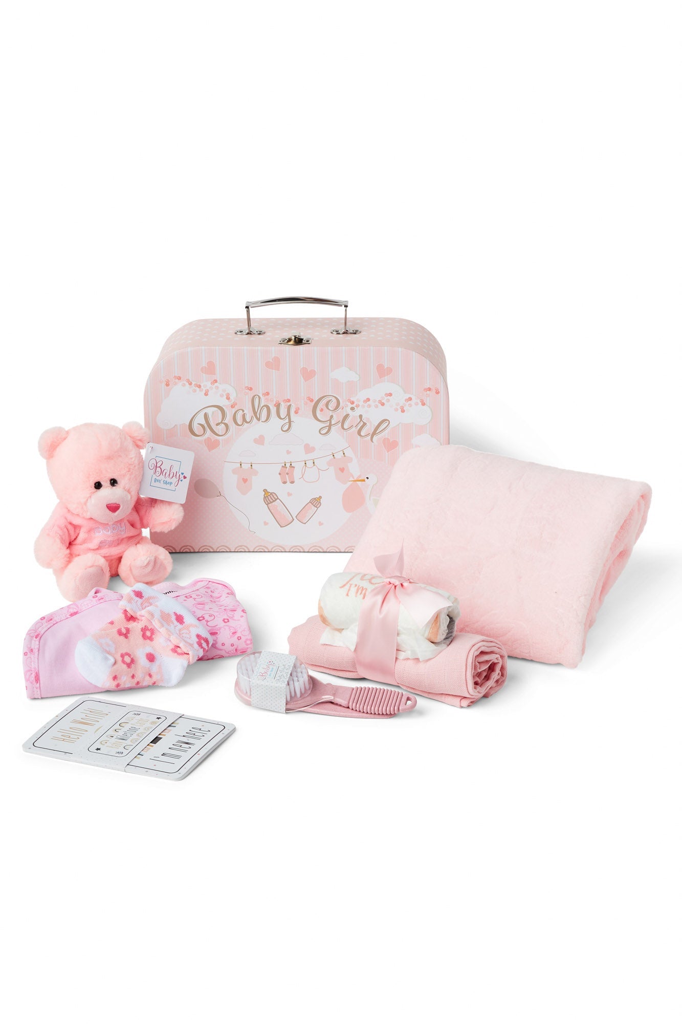 Step into the world of Baby Box Shop where you will discover essential newborn baby items carefully curated to make the early days of your little one smoother. This delightful Baby Box is packed with baby newborn essentials, from a cuddly Teddy Bear to a soft Fleece Wrap, all meticulously designed for your baby's comfort. The box case doubles as a baby bath box to organise all your baby bath accessories. Speaking of baths, our baby bath set includes a soft baby bath cloth and a gentle baby bath brush ideal for your newborn's delicate skin. Our set also includes a comfortable bodysuit, a pair of cosy socks, a Velcro bib and a muslin cloth to keep your baby warm and clean. Also included are baby bath essentials like 2 x nappies for those unexpected moments and a baby bath hair brush newborn for your little one's delicate scalp. But that's not all; we've included 8 double-sided baby milestone cards, perfect for capturing those precious moments. These make for unique baby shower gifts, baby girl gifts newborn and baby girl gifts newborn. The box also serves as a unique baby shower gift, a perfect choice for baby shower gifts girl or baby shower gifts girl. Whether you're looking for new baby girl gifts, personalised baby girl gifts, baby girl gifts keepsake or baby shower gifts unisex, Baby Box Shop has you covered. Each item in the box is selected keeping in mind the newborn essentials girl and girl would need. From baby bath towels newborn to newborn essentials girl, we've got it all. Baby Box Shop's unique baby girl gifts and baby girl gifts newborn hamper are designed to be cherished for a lifetime. Our baby bath towel set and baby bath kit make bath time a breeze. Our newborn essentials set and baby girl items newborn essentials are all you need to welcome your new bundle of joy. Join the Baby Box Shop family and give your baby the care they deserve.