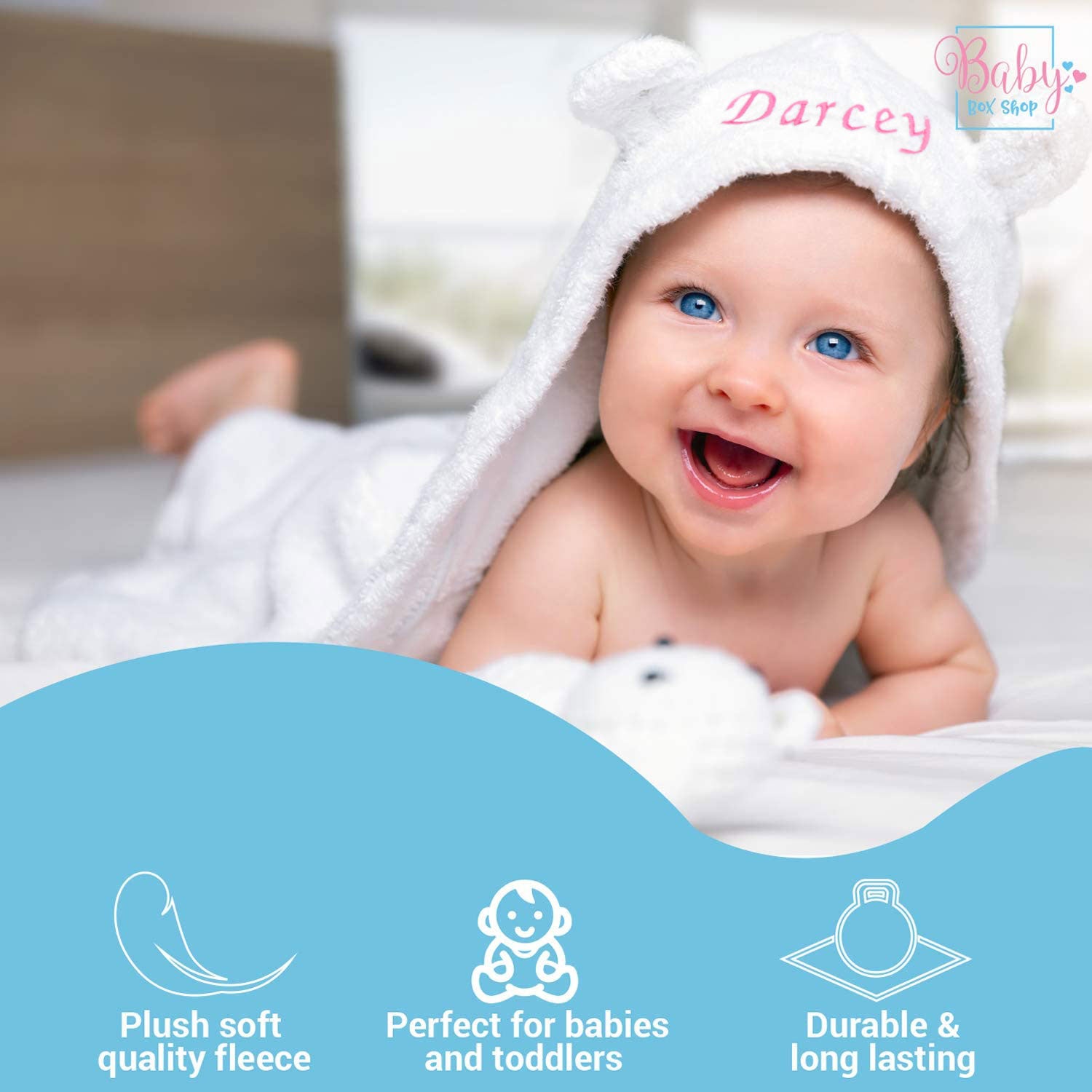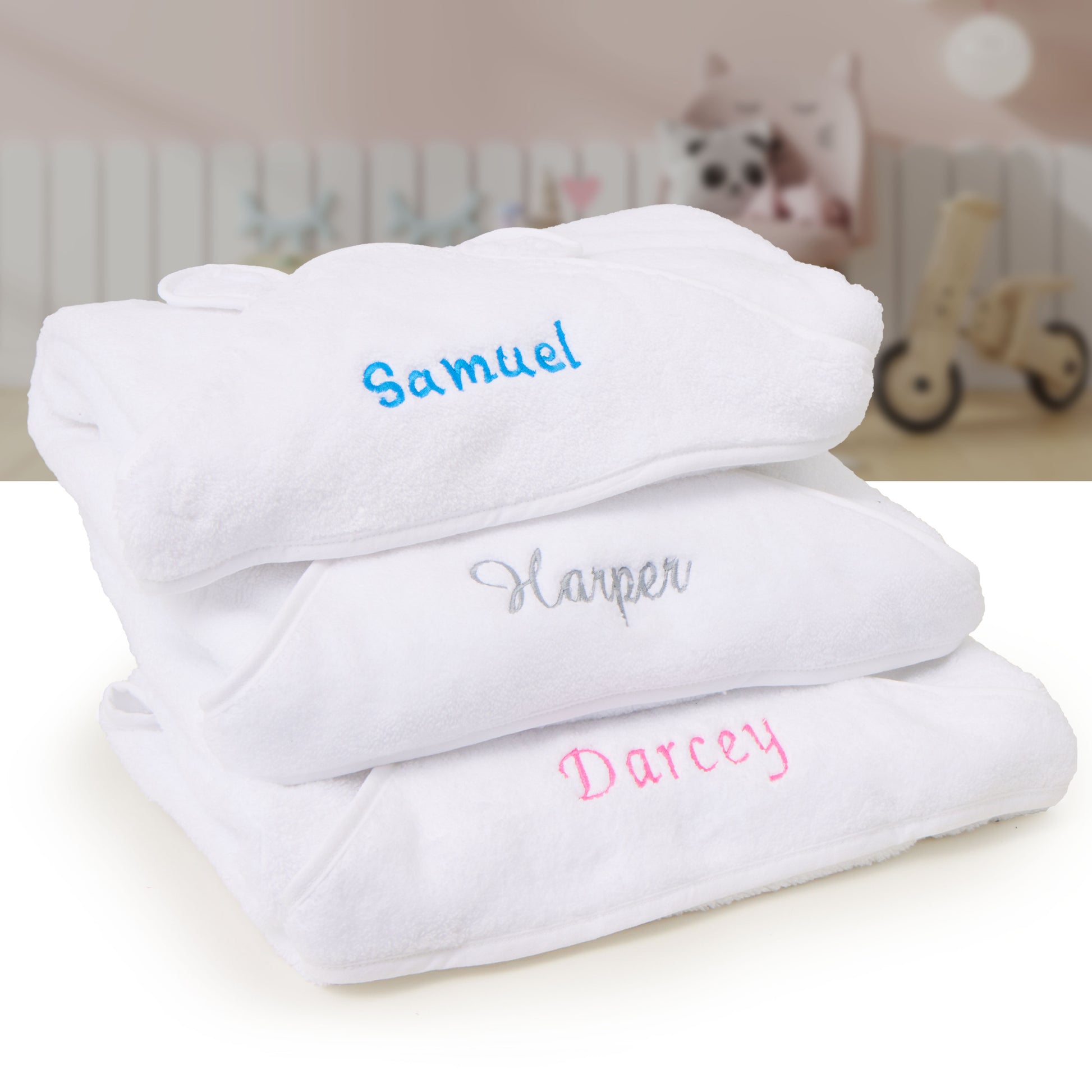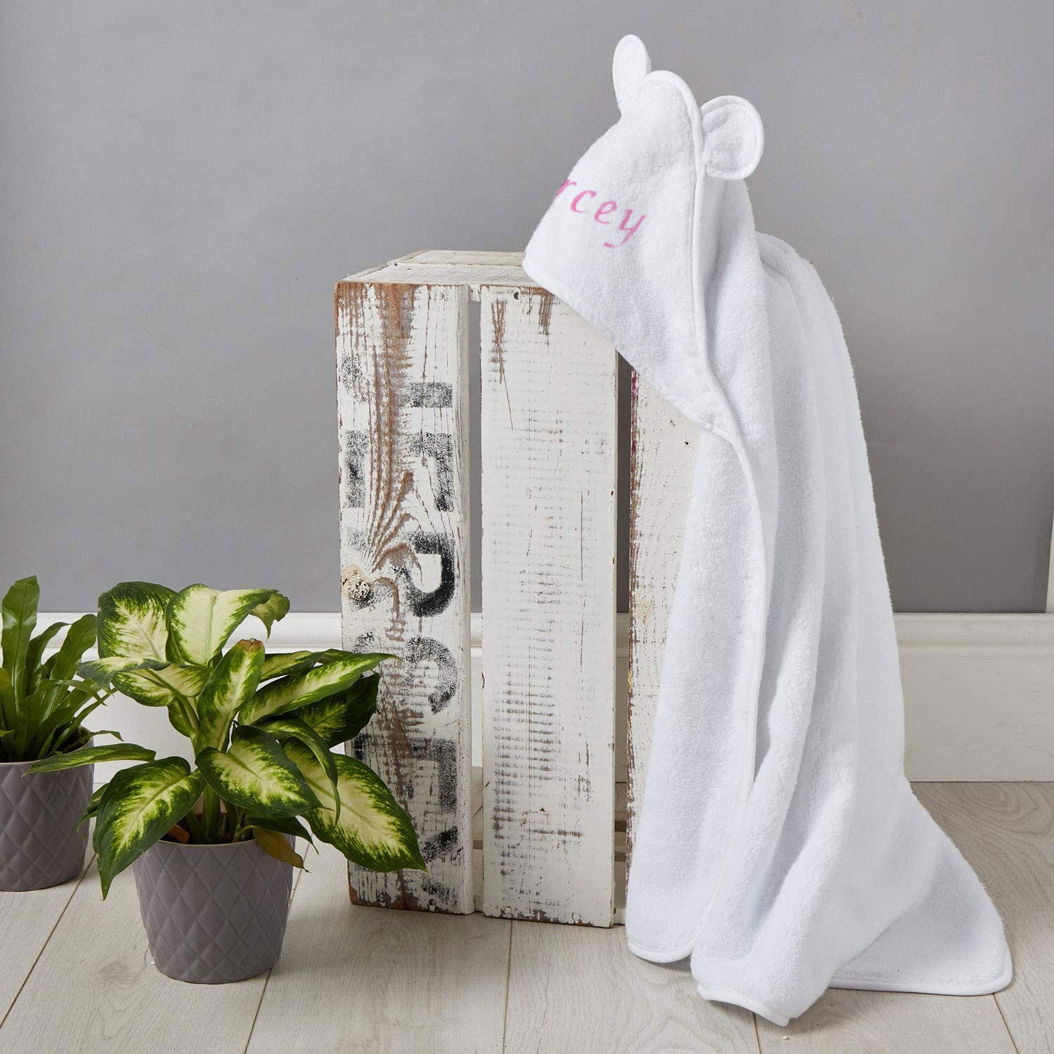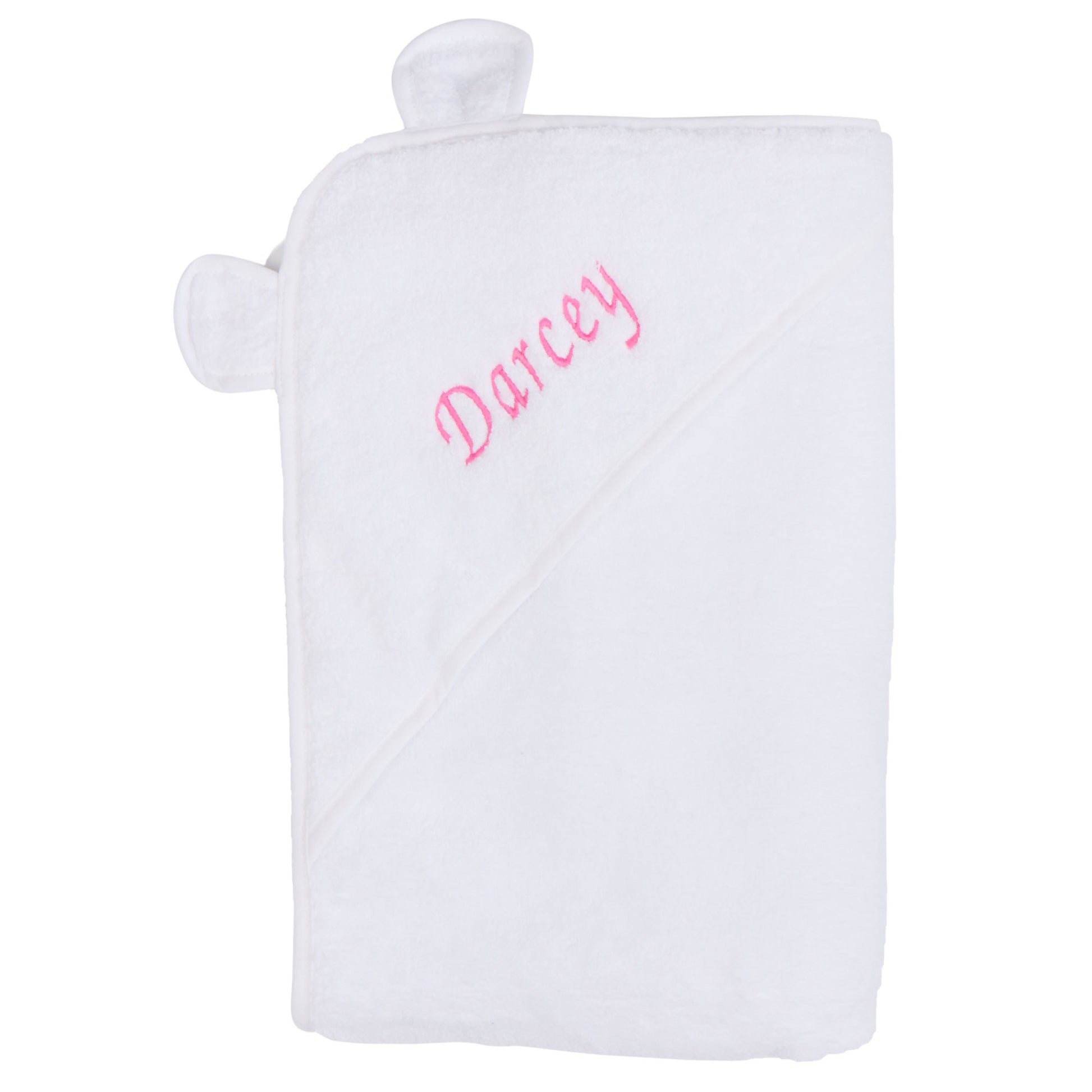 - Unique, Personalised Baby Gift - Make it memorable and personal. Congratulate parents on their new bundle of joy with this customised baby towel. You can have this unisex white baby hooded towel with ears embroidered using high quality threads with baby’s name, monogram or initials. Parents will surely be pleased with the photo opportunities!