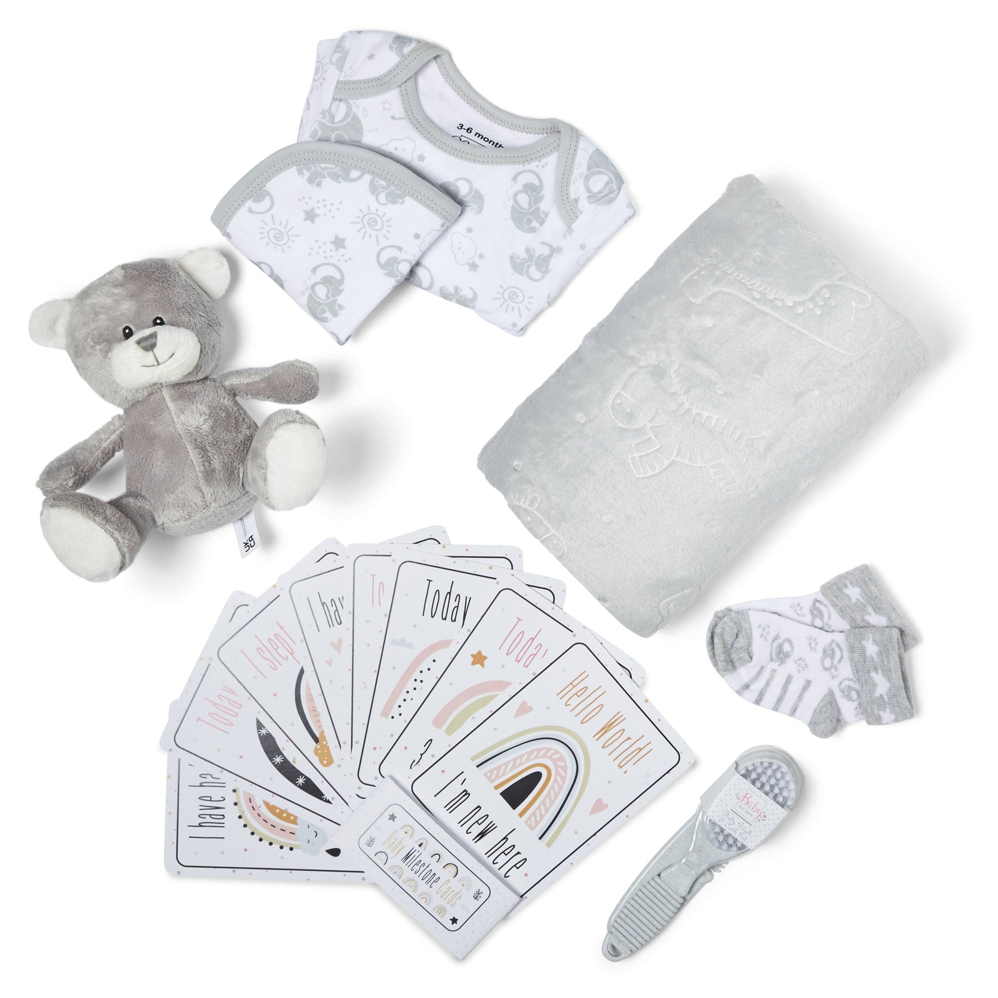 - Perfect Baby Gifts: This hamper contains a cute teddy bear, a bodysuit, a pair of socks, and a velcro bib - the best baby gifts newborn parents could ask for incased in a cute unisex grey baby hamper. Size dimensions: L: 29.2 x W: 21.6 x H: 10.1
